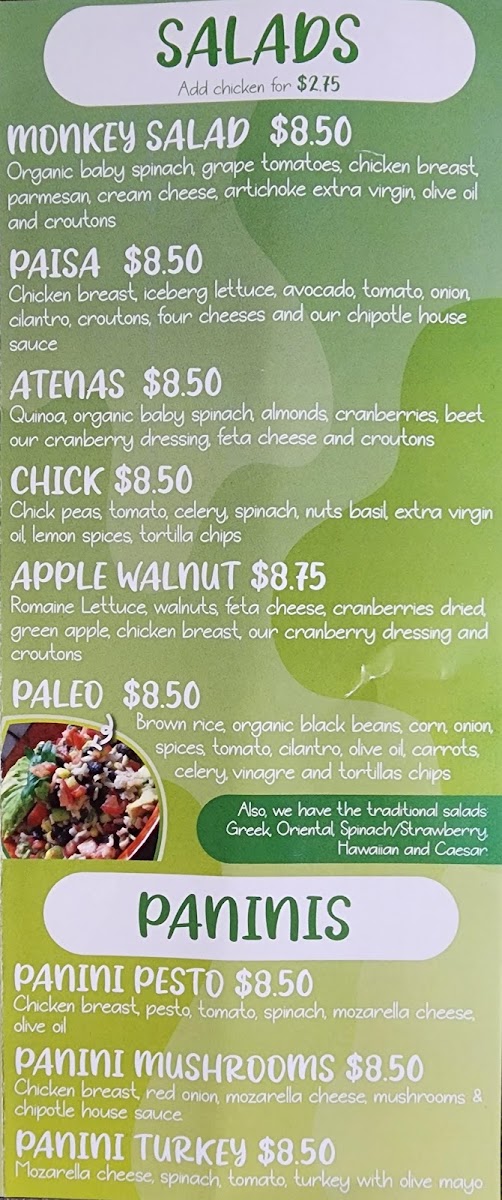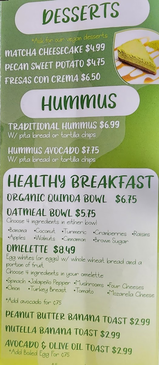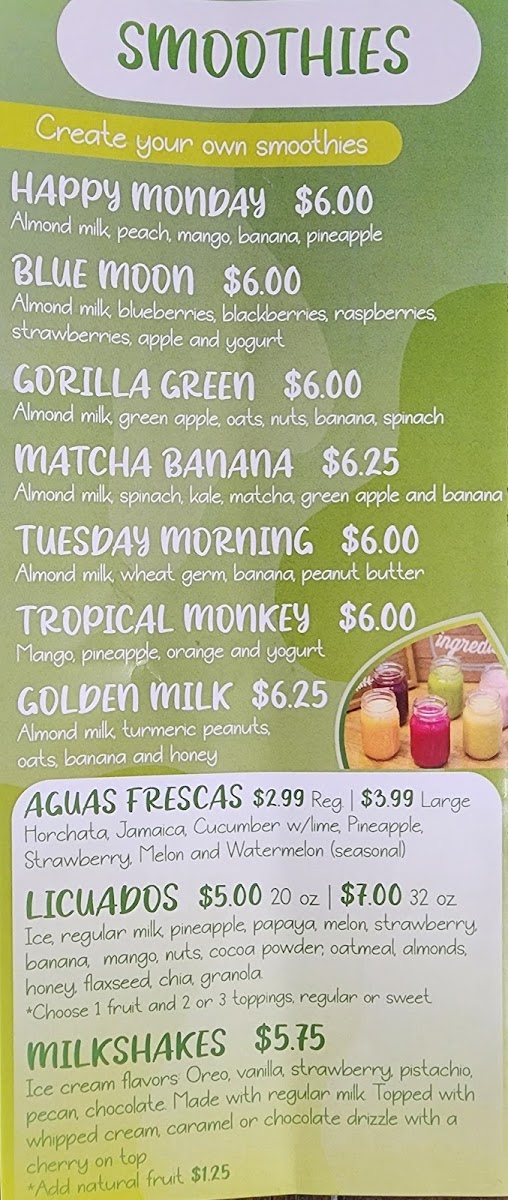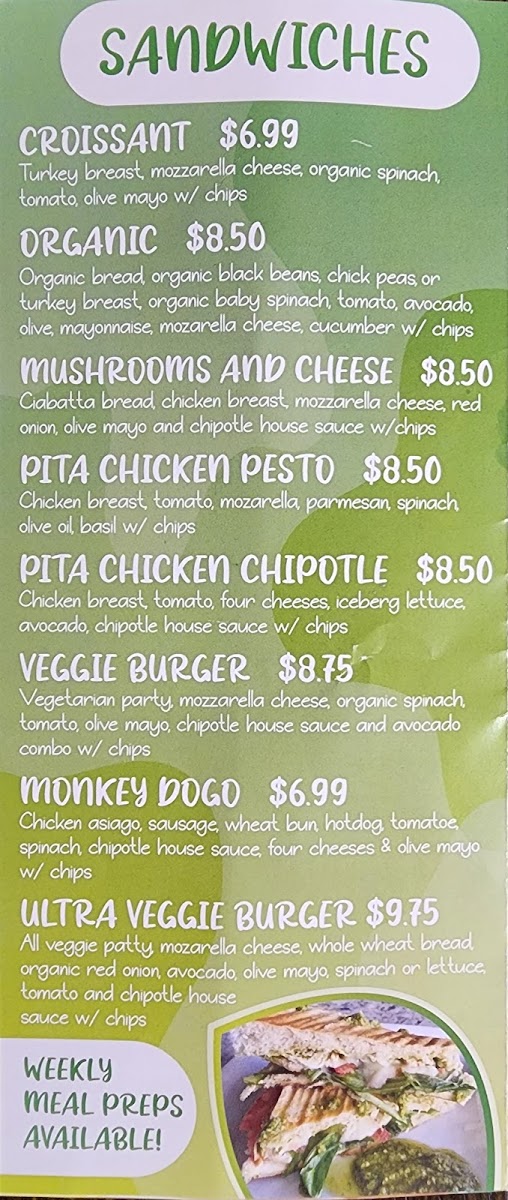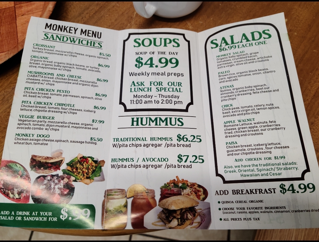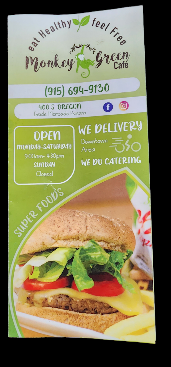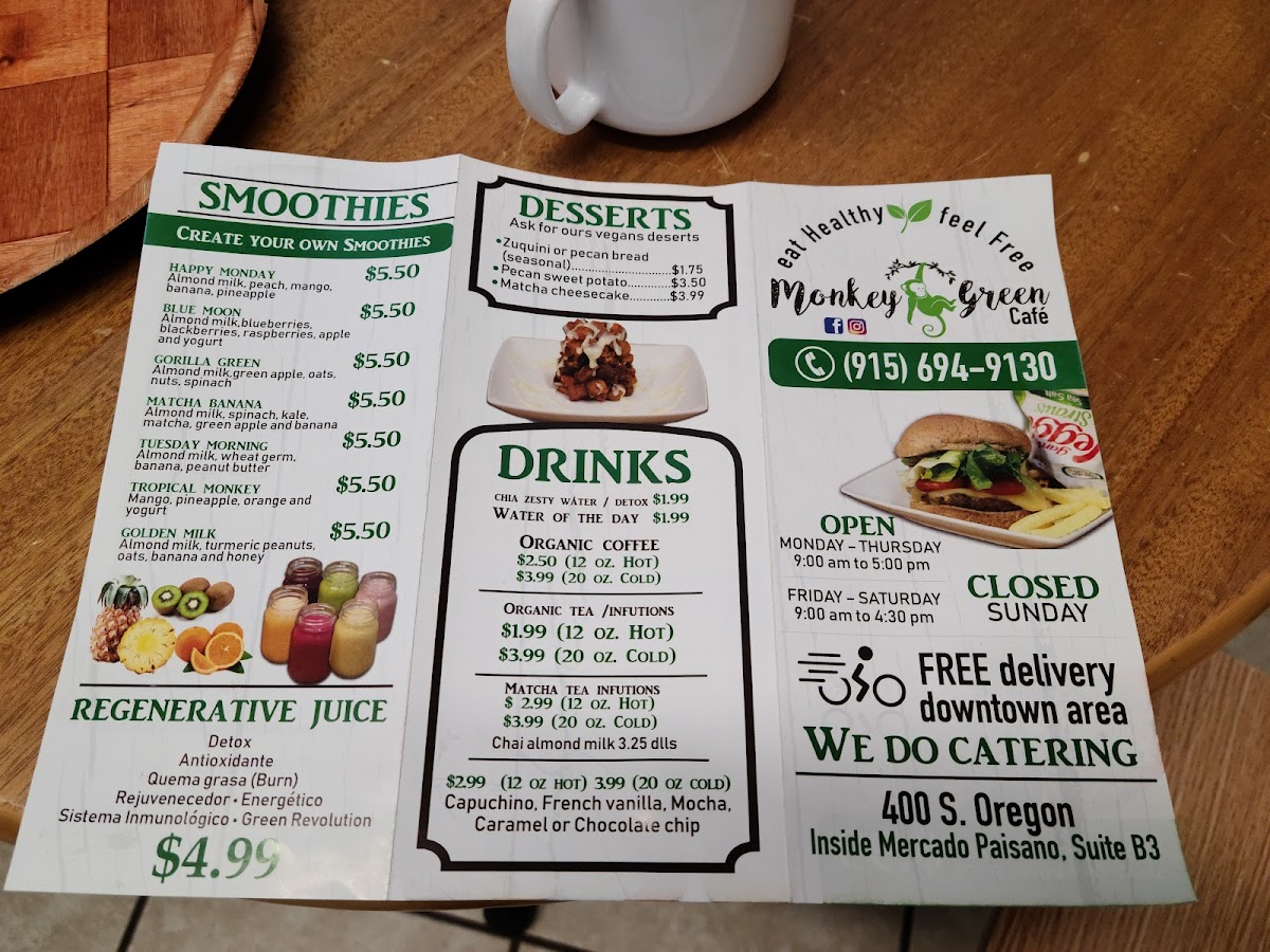 Step into a vibrant, welcoming atmosphere at Monkey Green Café, a hidden gem on Texas Avenue in El Paso, where the focus is on fresh, flavorful dishes that brighten up your day. The Monkey Green Café Menu offers an exciting mix of wholesome breakfast options, energizing smoothies, and satisfying lunch plates, all prepared with a passion for quality ingredients. From savory sandwiches and hearty wraps to vibrant salads, each dish is crafted to bring out bold, natural flavors that will have you coming back for more. The café’s cozy vibe and creative menu make it the perfect spot to grab a quick bite or enjoy a laid-back meal with friends. Whether you’re in the mood for something light or a bit more indulgent, Monkey Green Café has something to satisfy every craving.